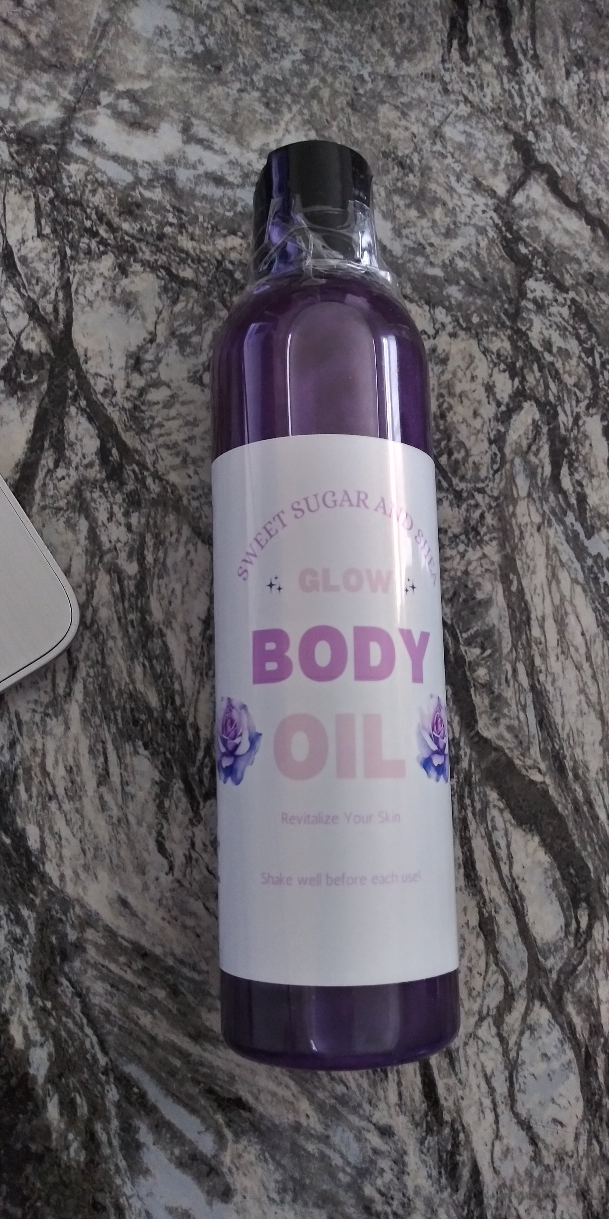 It's made with: Apricot Oil, Almond Oil, Sunflower Oil, Rosehip Oil, essential oils, vitamin E, fragrance, and skin safe mica powder.